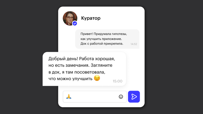 Комментарии опытного продакта помогут посмотреть на продукт ещё глубже и добавить в решения больше логики. А ещё куратору всегда можно задать вопросы.